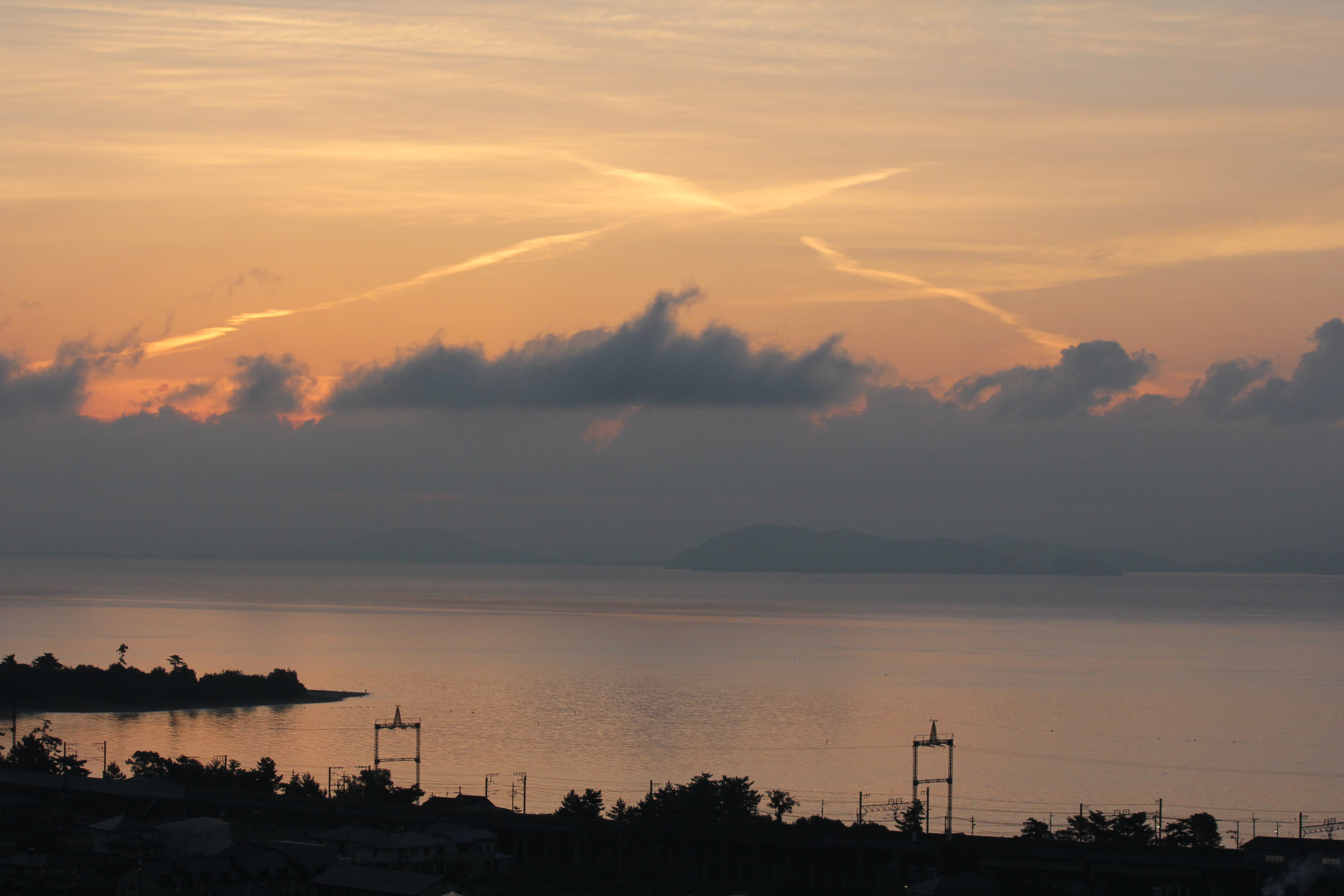 朝焼けの琵琶湖の空