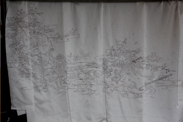 付け焼刃の知識ですので考証がおかしければ訂正していただきたく思いますが、M様のものを基調に、雅楽等で使われる古楽器と流水紋(琳派でも観世でも)に四季の草花・扇等々を入れていただければと考えております。西洋楽器ですがフルートをやっていたので、雅楽三管と呼ばれる笙・龍笛・篳篥(特に笛メインで)を襟元から肩にかけて入れていただけると光栄ですが、図案にも因りますのでこちらはバランスを見ていただければと考えております。(雅楽、と書きますが造形が深いわけではありません…。M様の琵琶や琴に加えて楽太鼓等も入ると華やかかなとぼんやりと考えていますが、何分不勉強なので申し訳ありません。正倉院の各楽器・平等院の雲中供養菩薩像などで使われる楽器等を入れていただければと考えております。