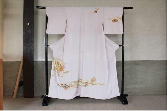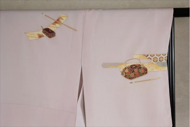 ザ・訪問着といった絢爛豪華なものではなく、さりげない感じで書道具が描かれているイメージです。