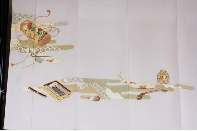 書道具を散らしたオーダーならではの訪問着になりました。書道具のバックに四季の草花を淡く入れますと出来上がり以上に着ていただきやすい着物に仕上がったと思います。