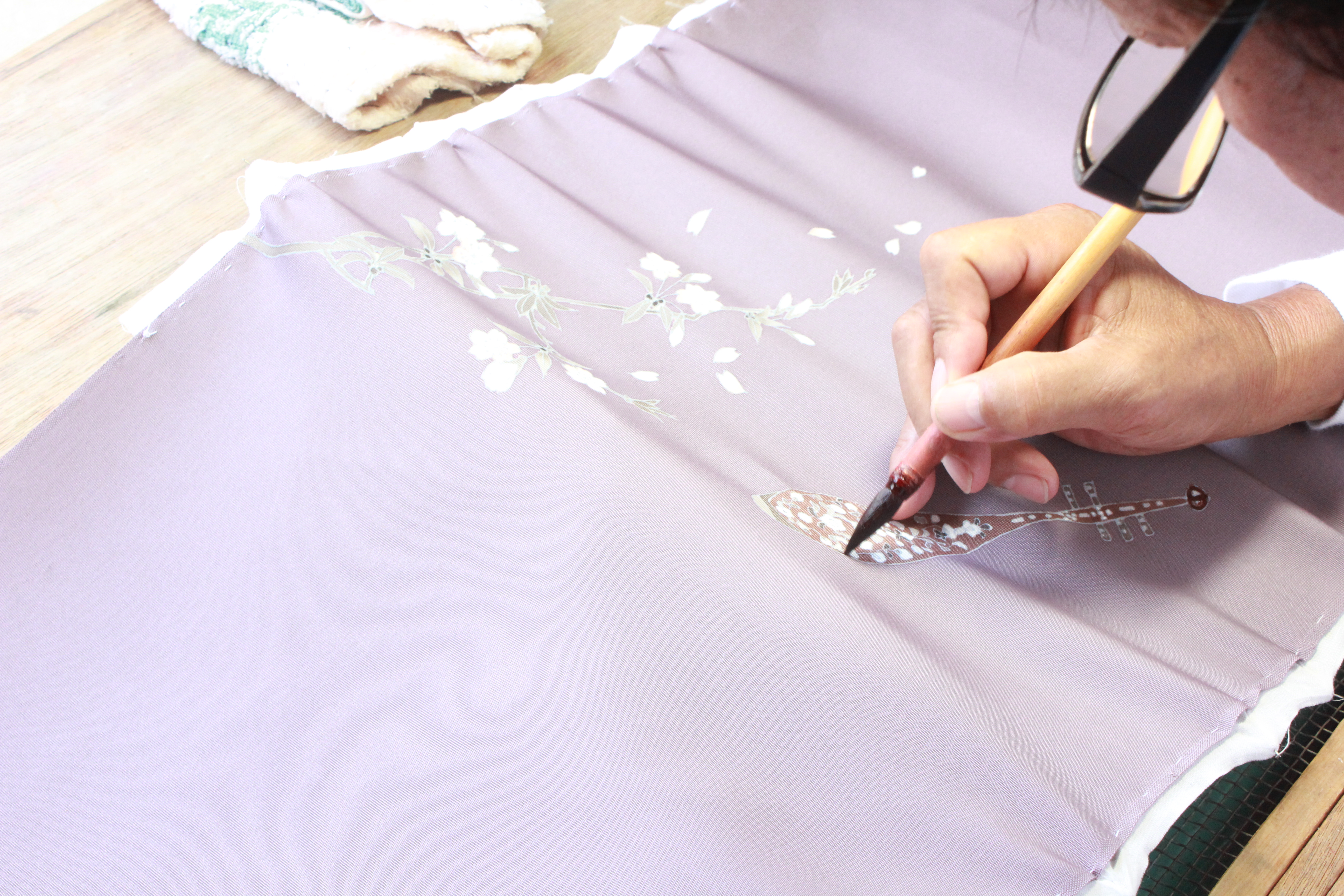 図案作成―生地購入―下絵―糸目、糊伏せ―地染―蒸し、水元―友禅―蒸し、水元、水洗―湯のし―柔軟仕上げ―金彩―仕立て