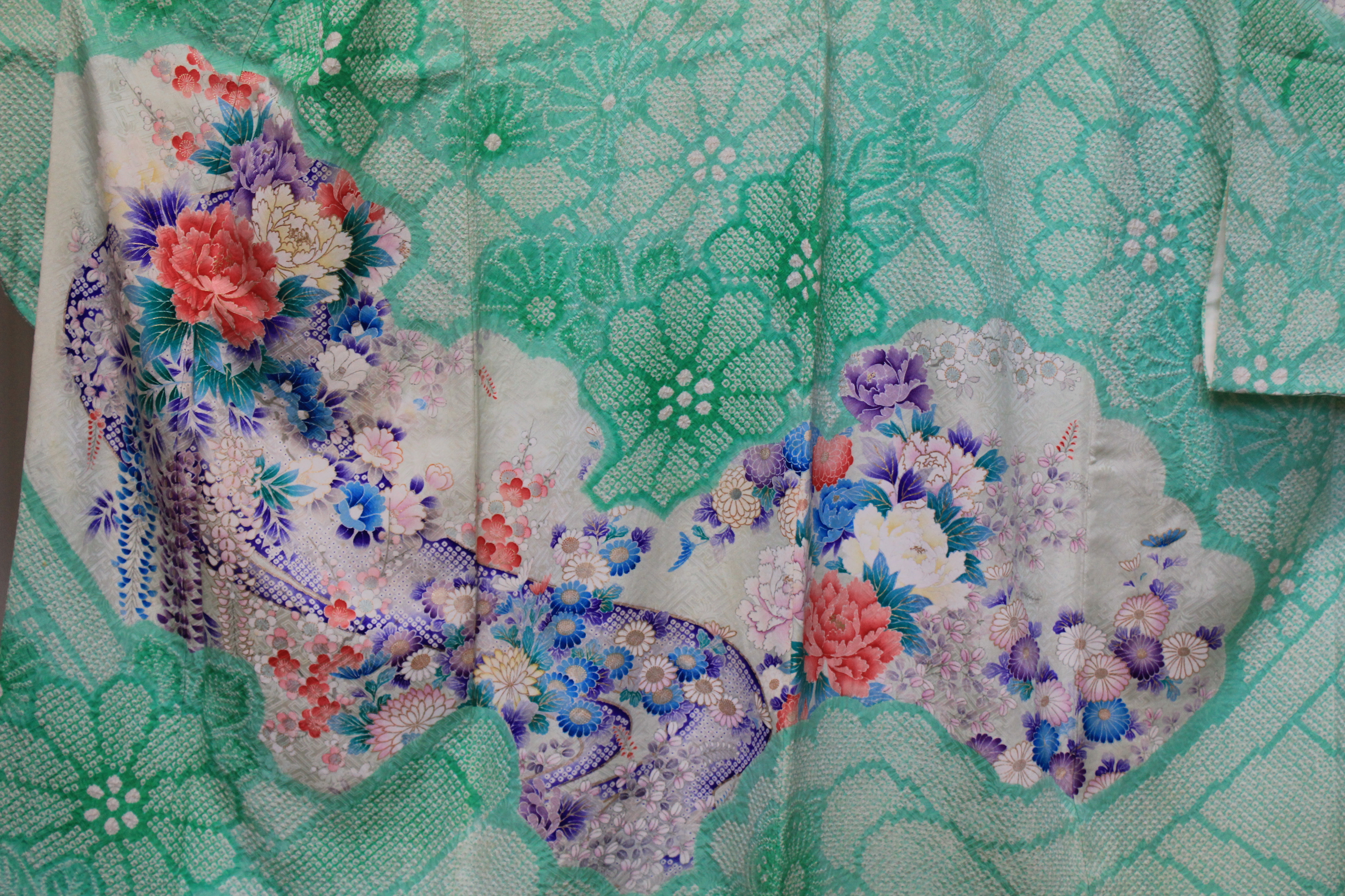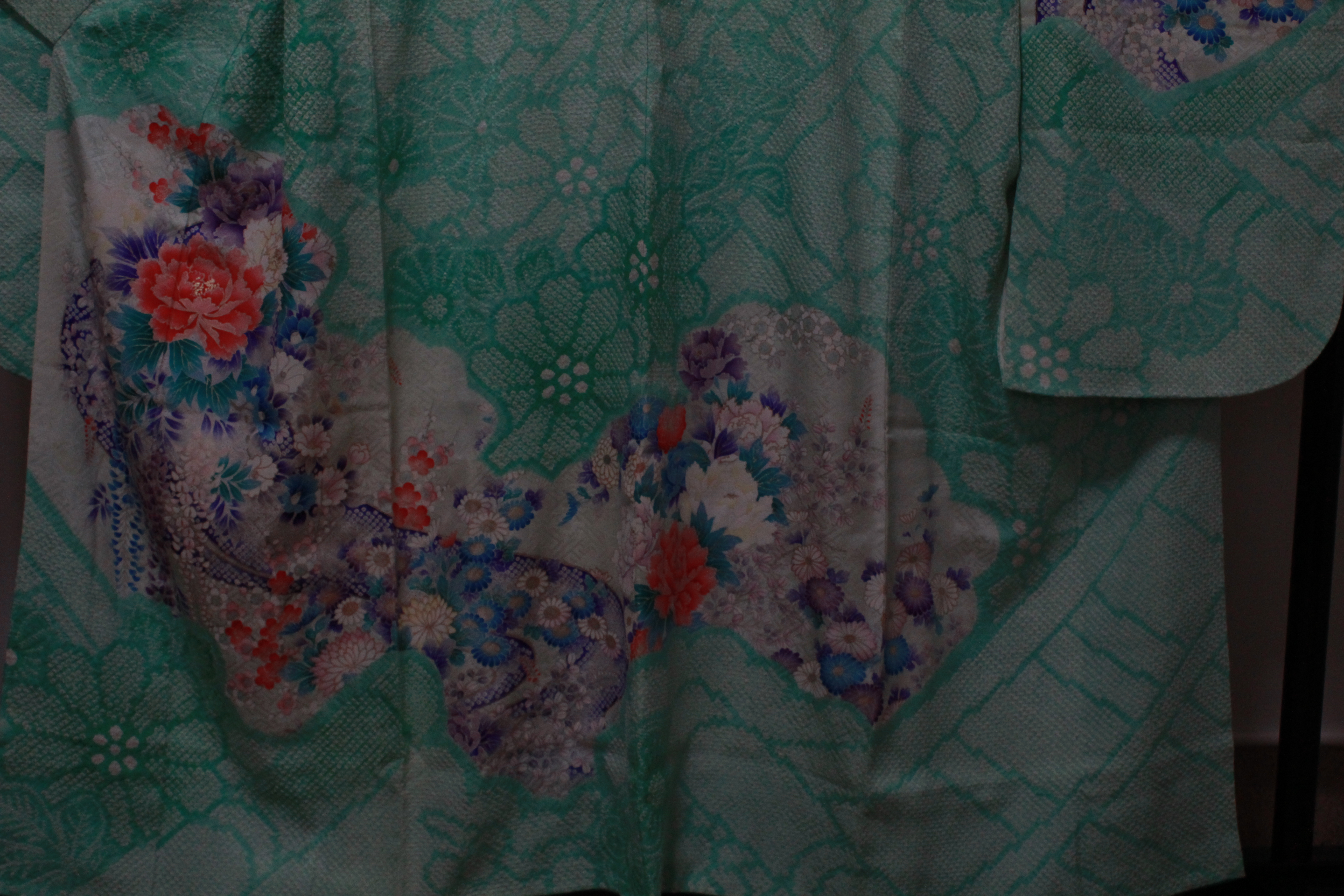 淡い緑の素掘り模様の振袖をいただいたのですが,表も裏も汚れがあります。身長155センチの妹もいますので、裄や身幅は大丈夫だと思いますが袖丈が長いので身長150センチのの自分に合わせて短くしたい。